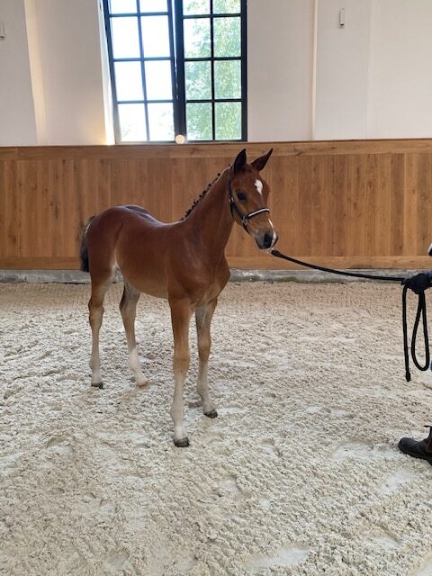Ein sehr typvolles und bewegungsstarkes Stutfohlen vom mittlerweile S-erfolgreichen For Kingdom, welcher auch Bruder ist zur Doppelweltmeisterin Woodlander Farouche.